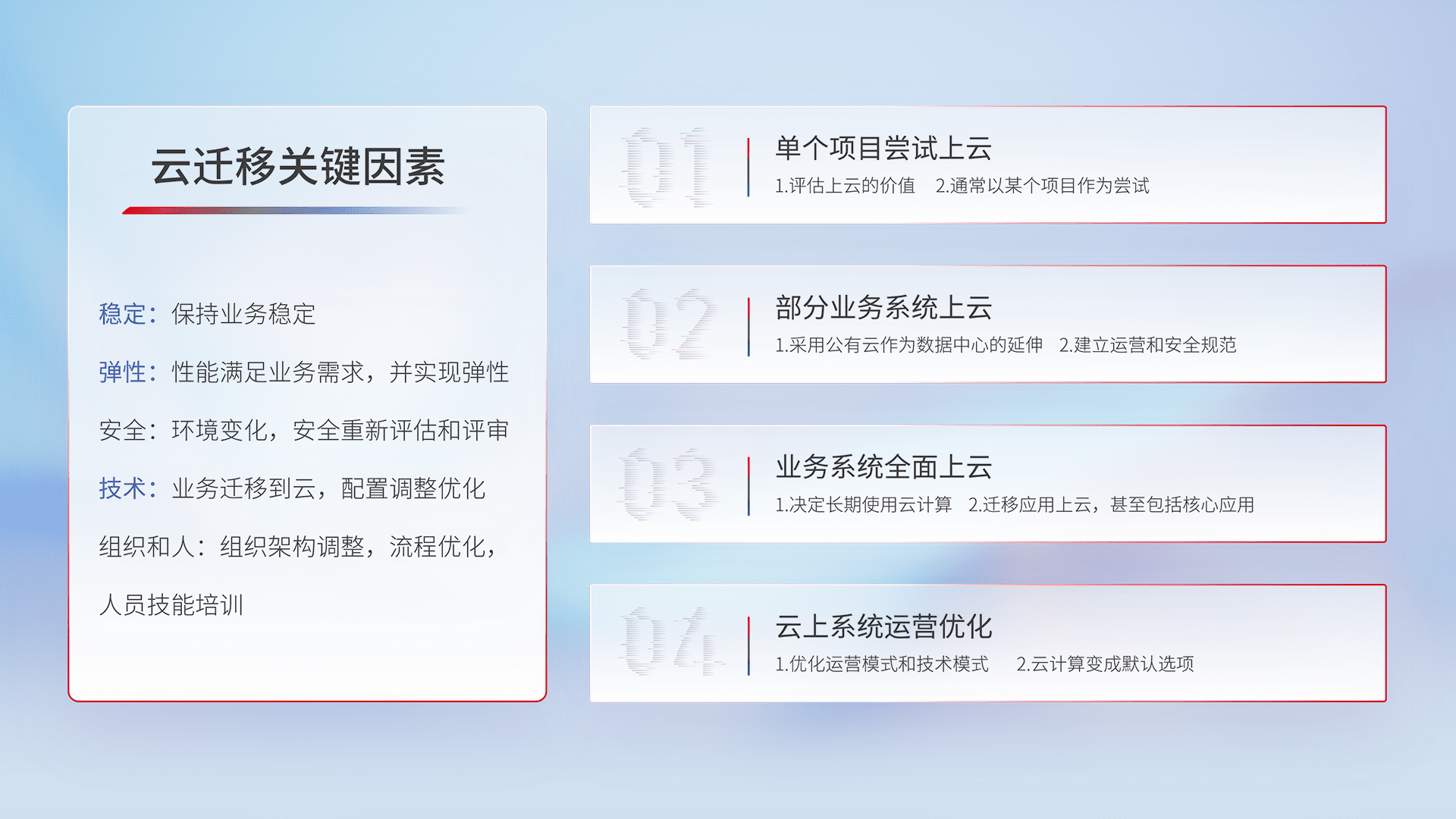 结合实际业务,,从规划设计、、云平台选型、、、云原生改造、、、数据迁移、、、集成交付,,,,迁移全过程为客户识别最佳上云路径,,,,做好风险识别管理,,,设计网络架构、、、、身份权限、、、、安全审计合规、、、、操作审计、、日志审计、、、、监控告警策略、、、、多站点容灾设计等,,,对云上基础设施进行整体规划,,,,提升IT治理水平,,,以满足弹性、、高可用、、、高性能的需求。。。