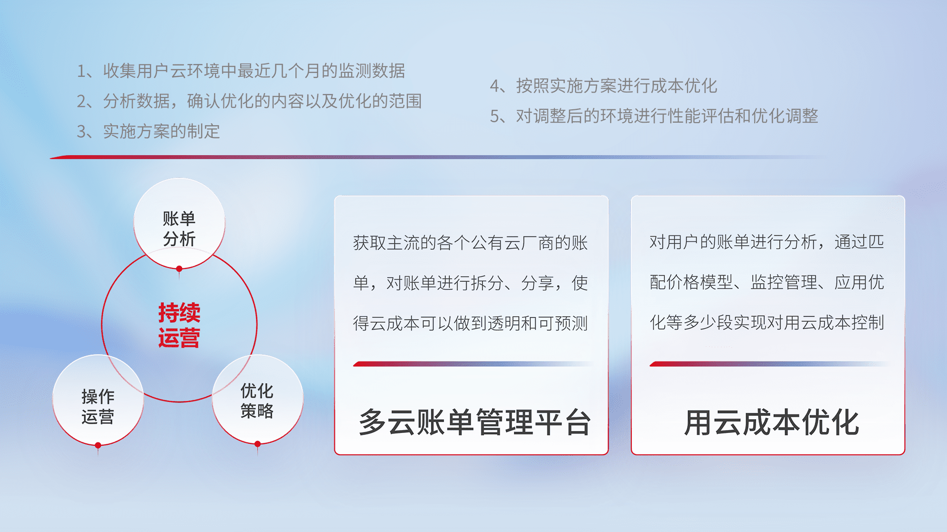 通过多云纳管,,,以统一的资源数据模型把客户的云资源进行抽象和封装,,,,进而实现对多云资源的统一操作,,,保障云资源管理的可靠性、、、、稳定性与可用性。。。量身定制化运维内容,,配置、、、开发运维、、、补丁管理、、、备份、、、监控、、认证和访问管理、、、审计和日常巡检等,,保障在用云过程中的可靠度,,稳定度以及高可用率。。