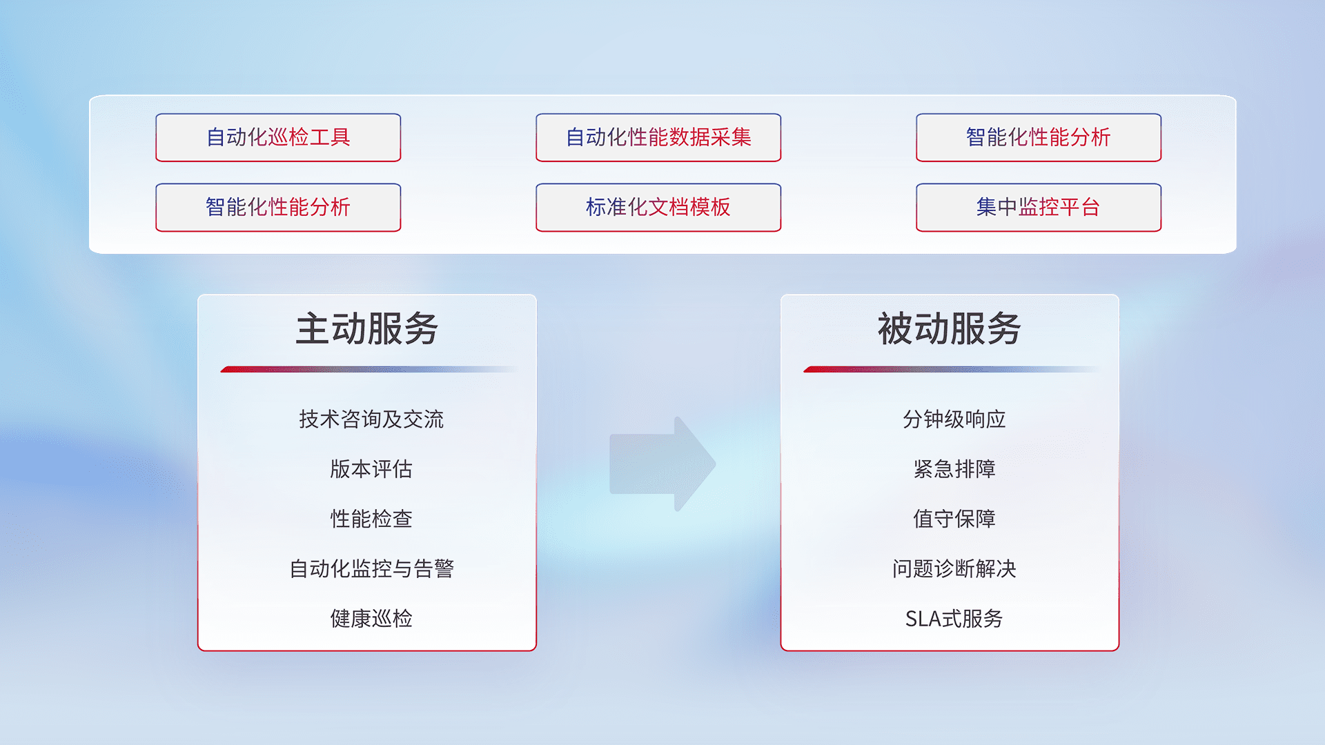 智能化工具和标准化文档,,保障服务质量,,,提供主动服务(包含技术咨询、、、、版本评估、、、性能检查、、、自动化监控与告警、、、、健康巡检)和被动服务包含(分钟级响应、、、紧急排障、、、值守保障、、、、问题诊断解决、、SLA服务)。。